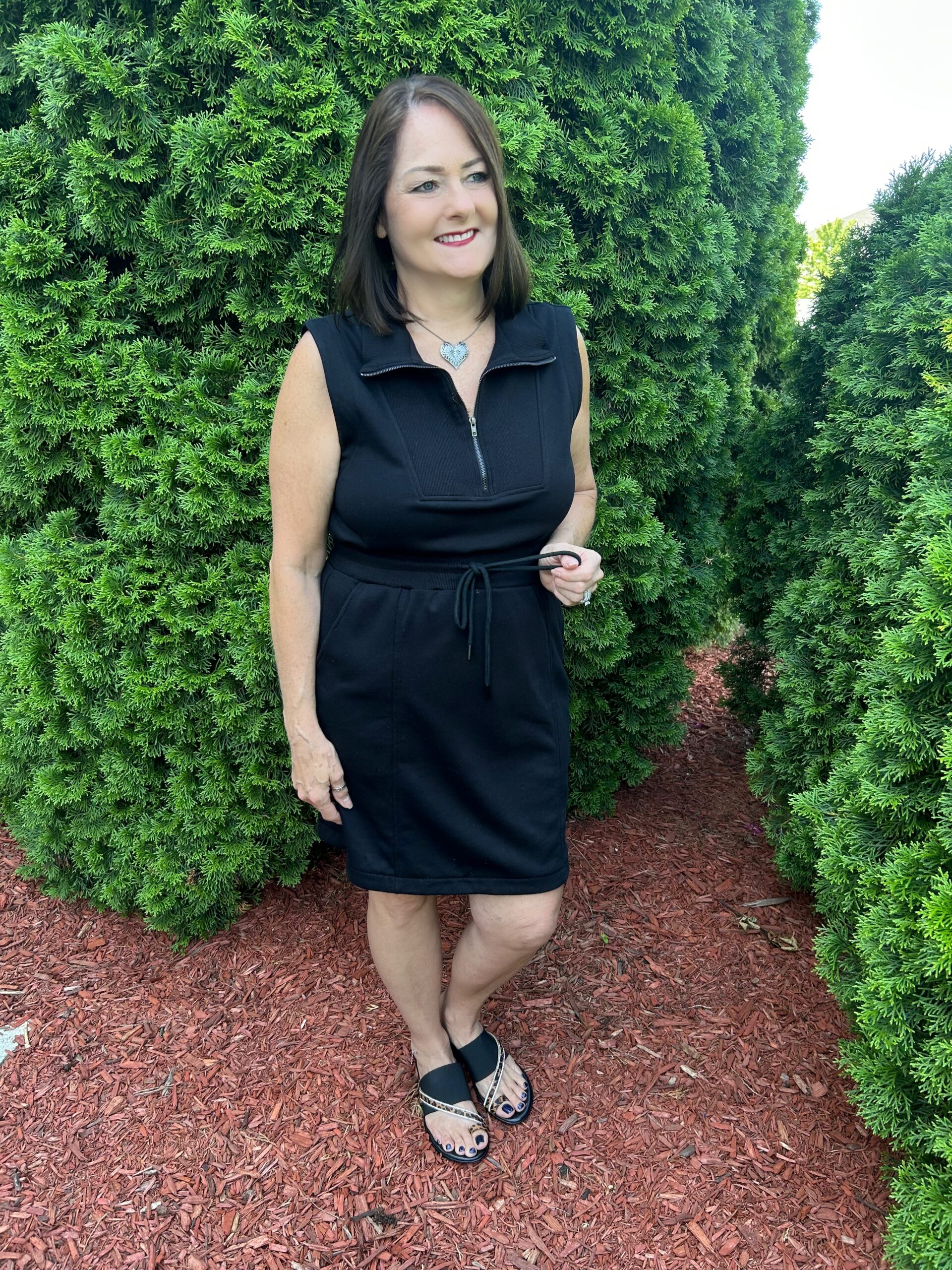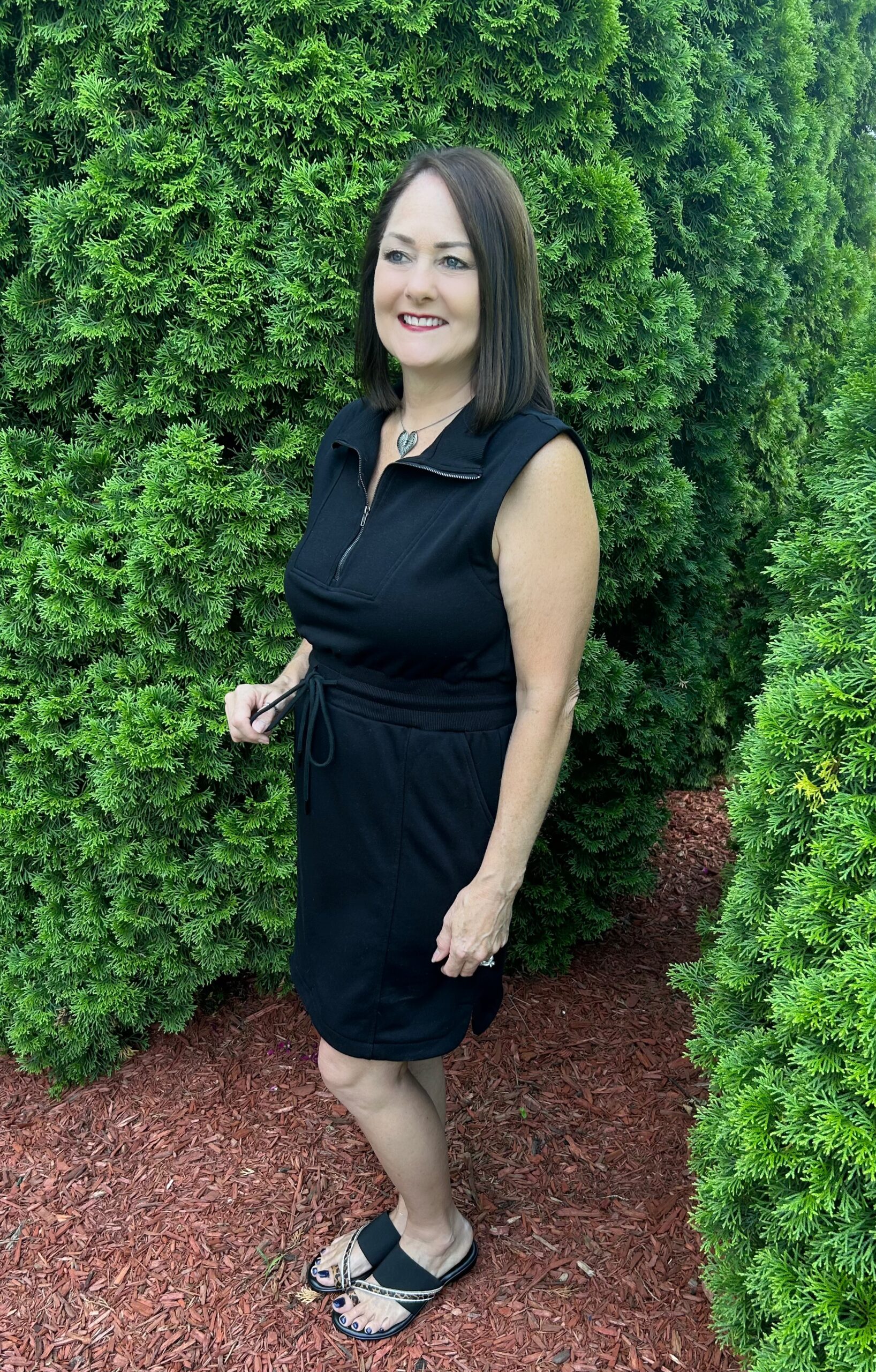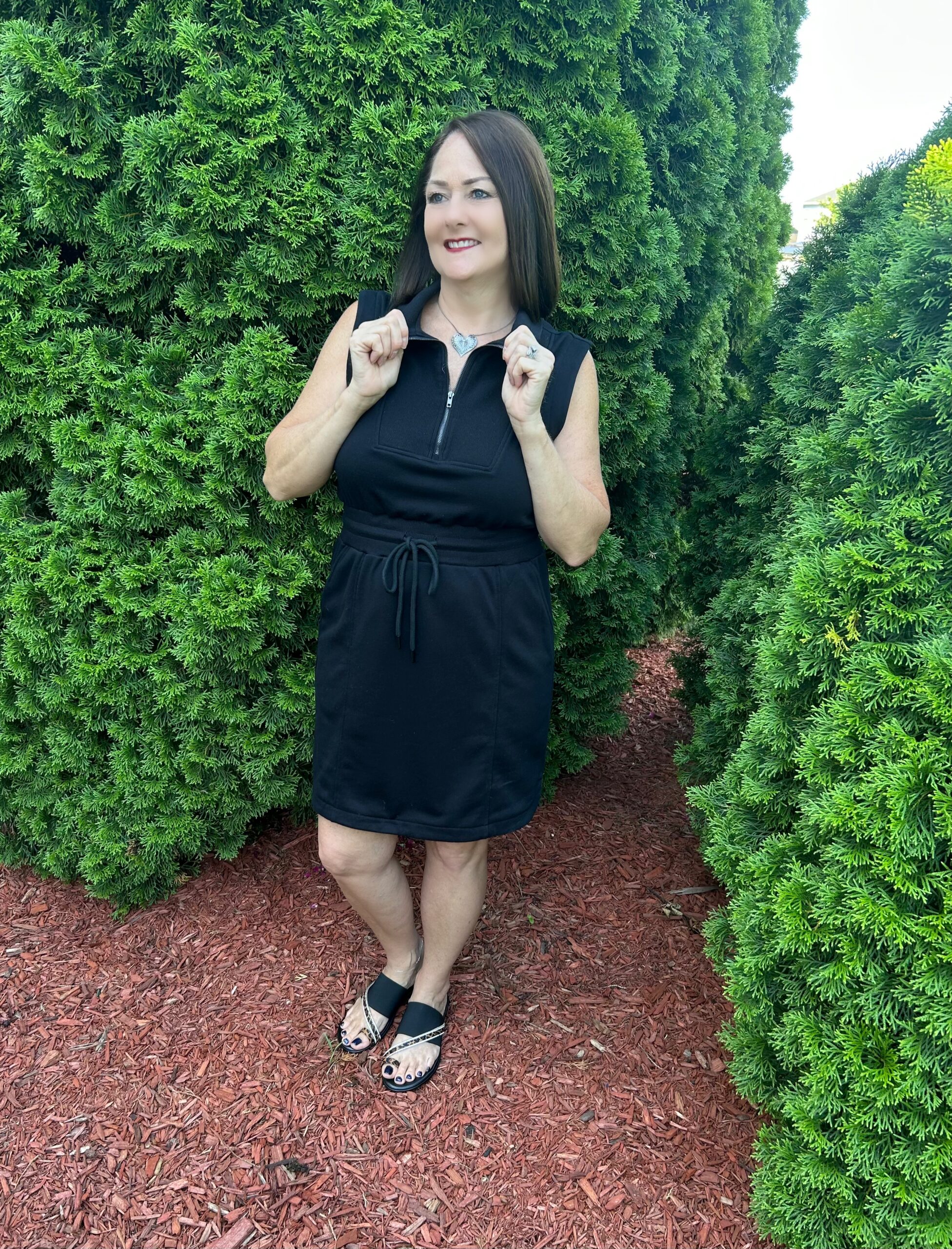 Black Zipped Collar Sleeveless Drawstring Waist Mini Dress