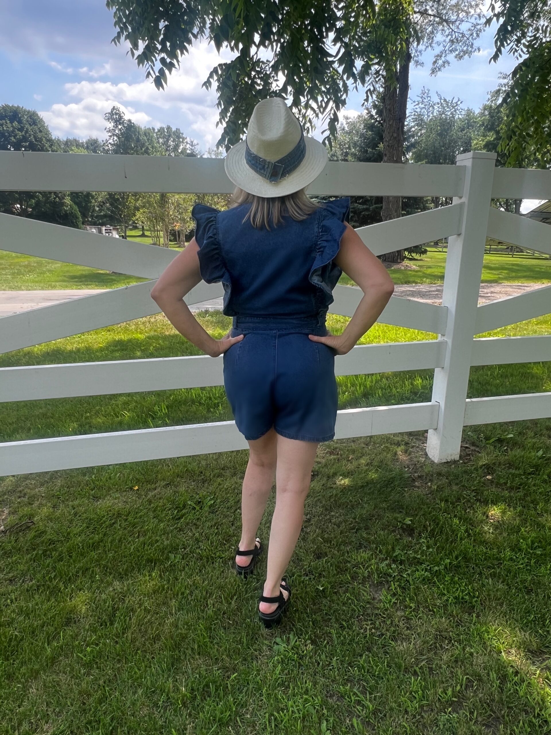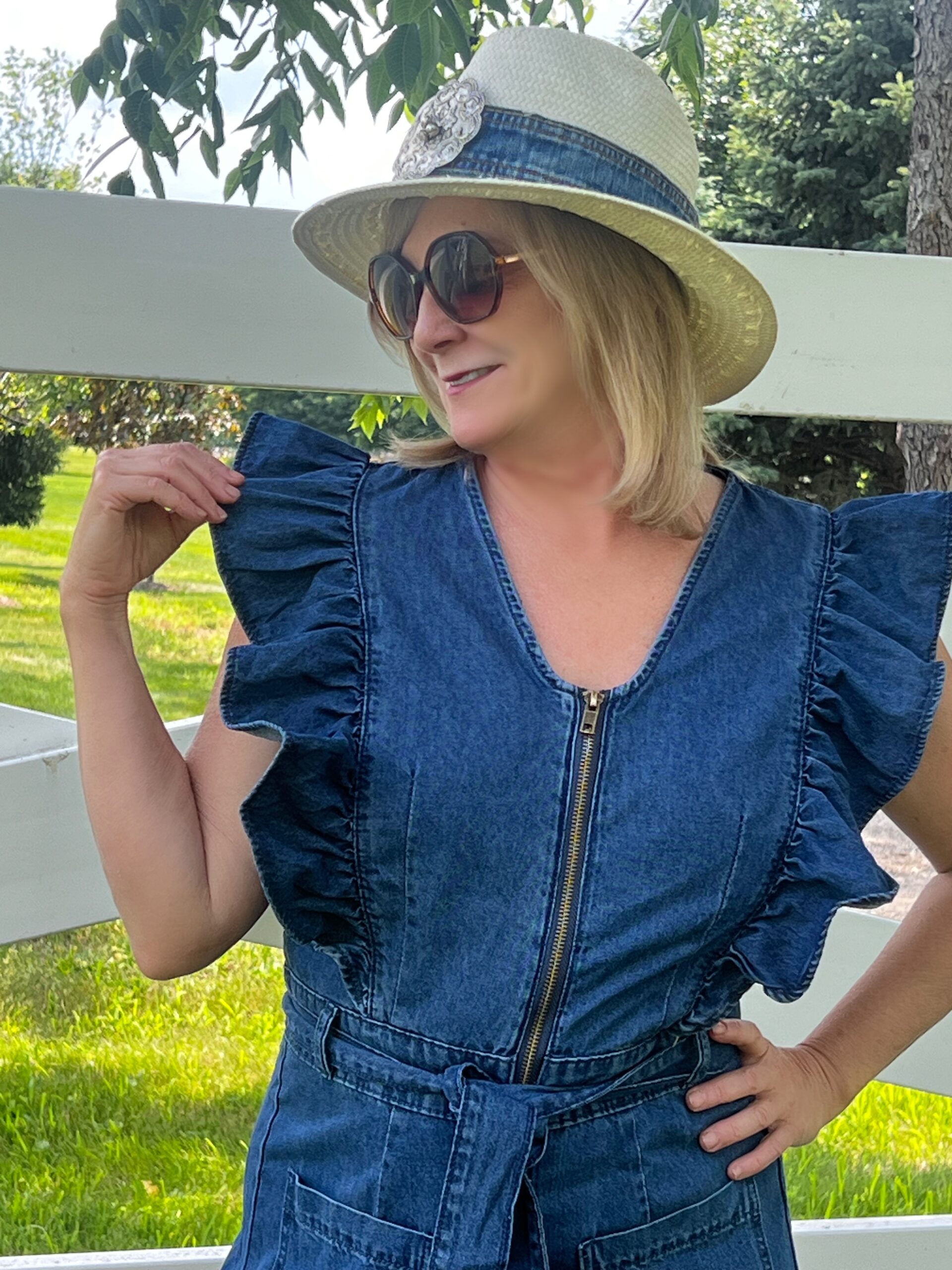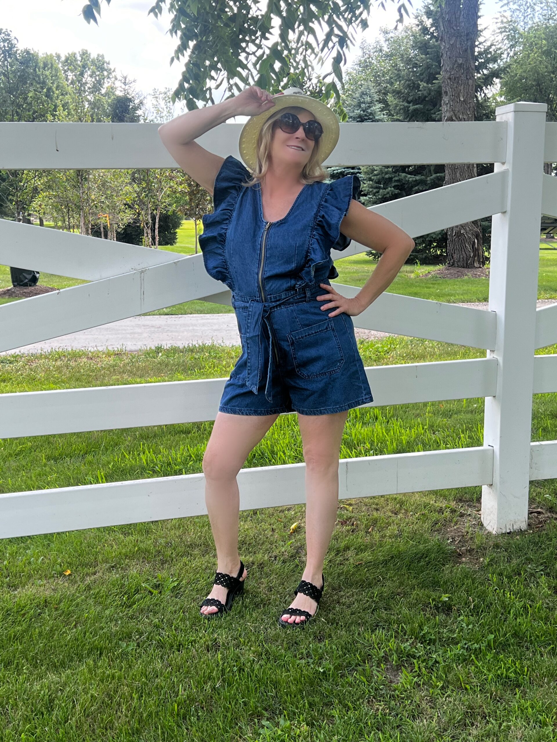 - Stylish ruffled design adds a trendy touch to this jean romper