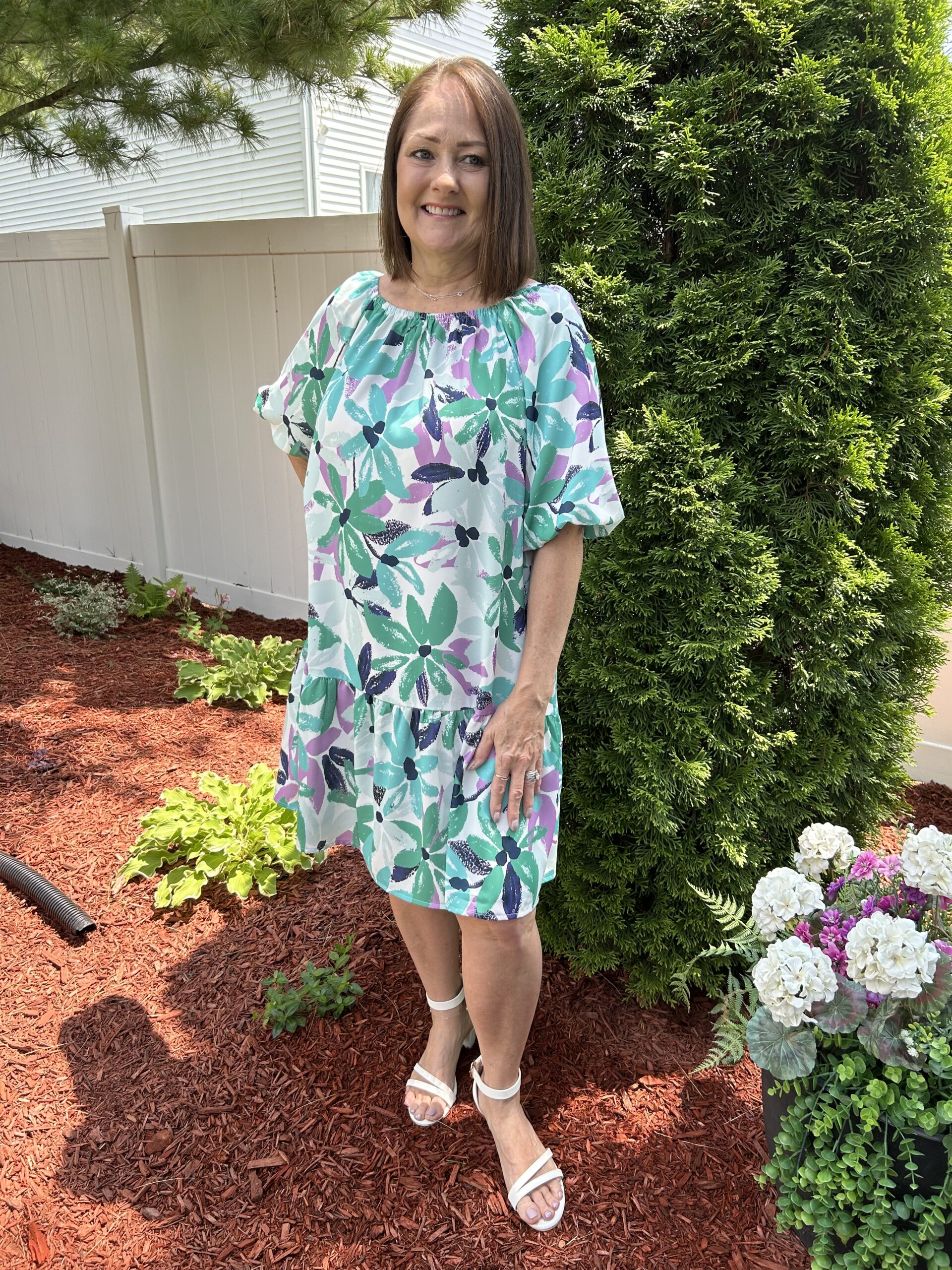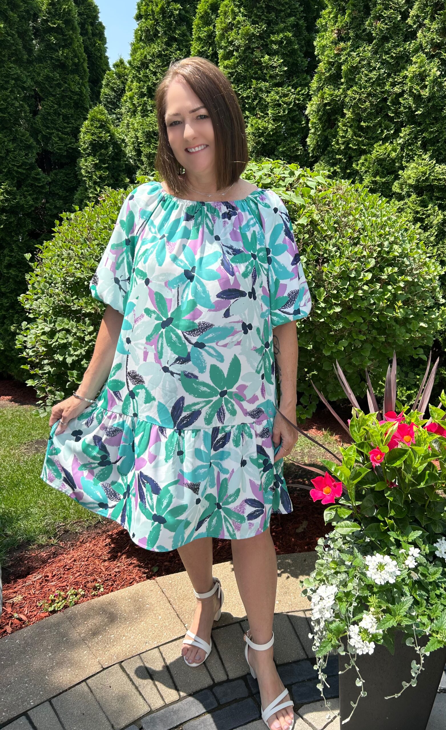 Green Floral Print Square Neck Loose Fit Mini Dress