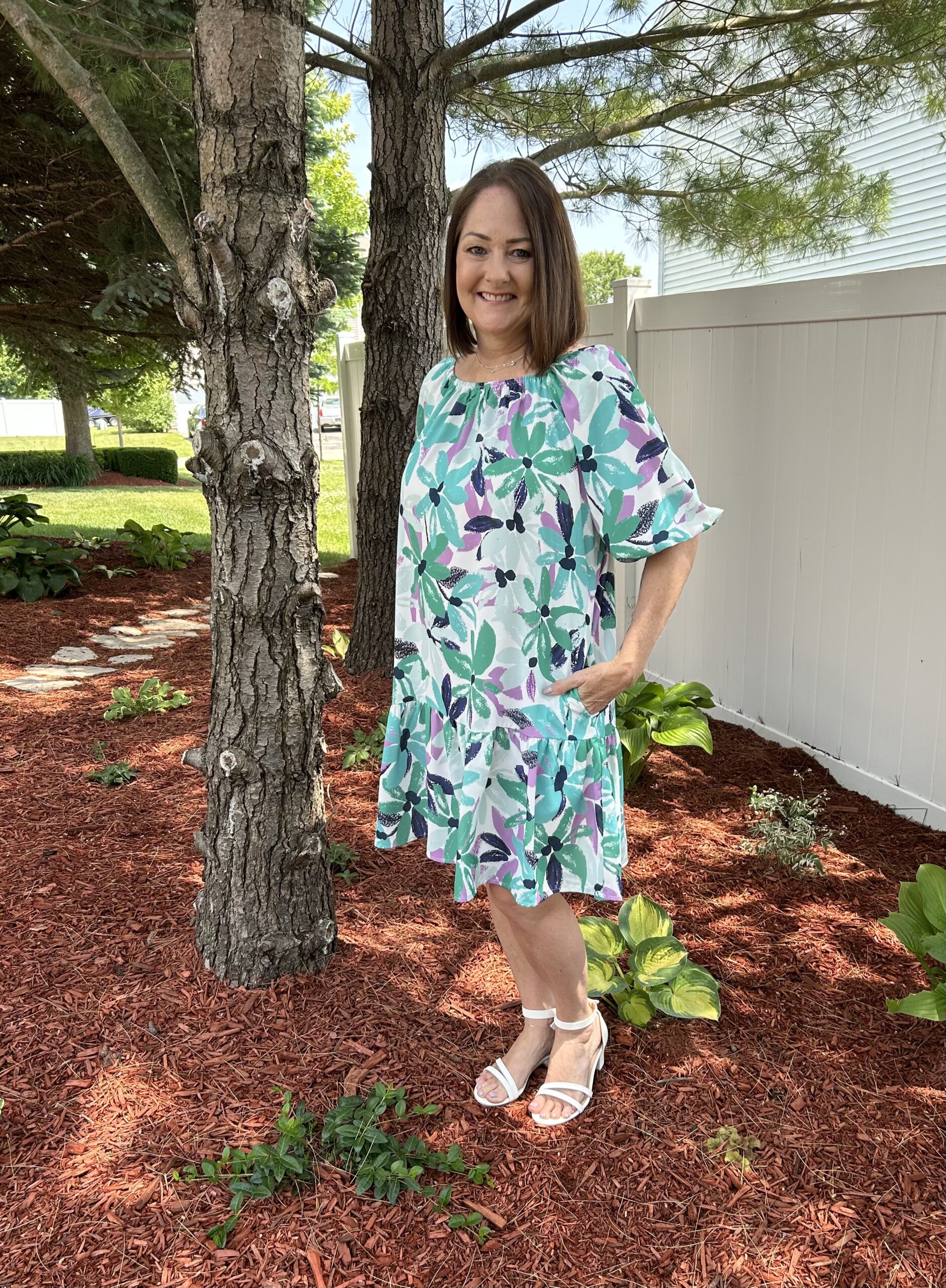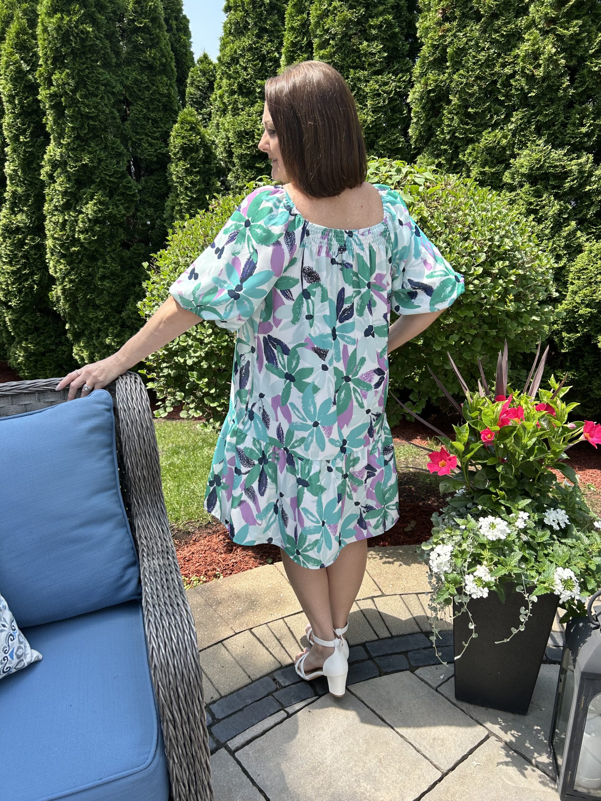 This mini dress features a flattering square neck with shirred trim.