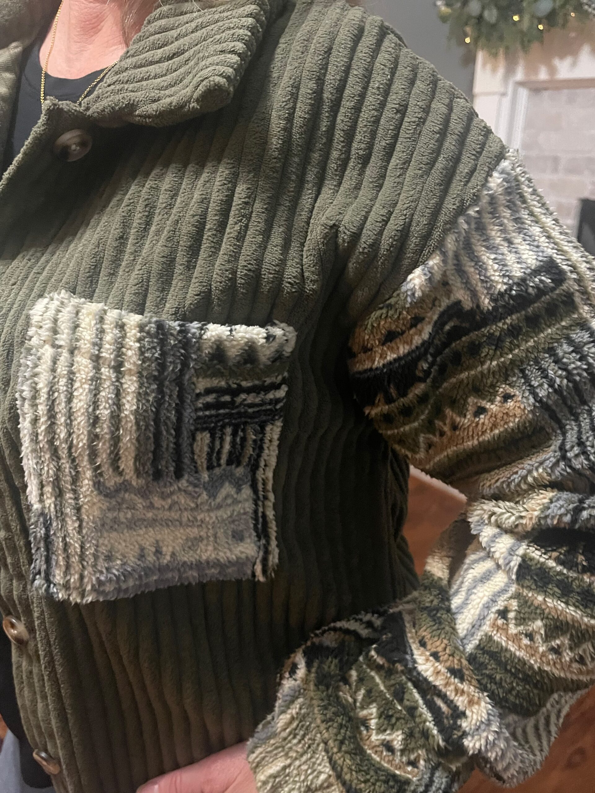 - The trendy patchwork pattern gives a visually interesting look that stands out from basic outerwear.