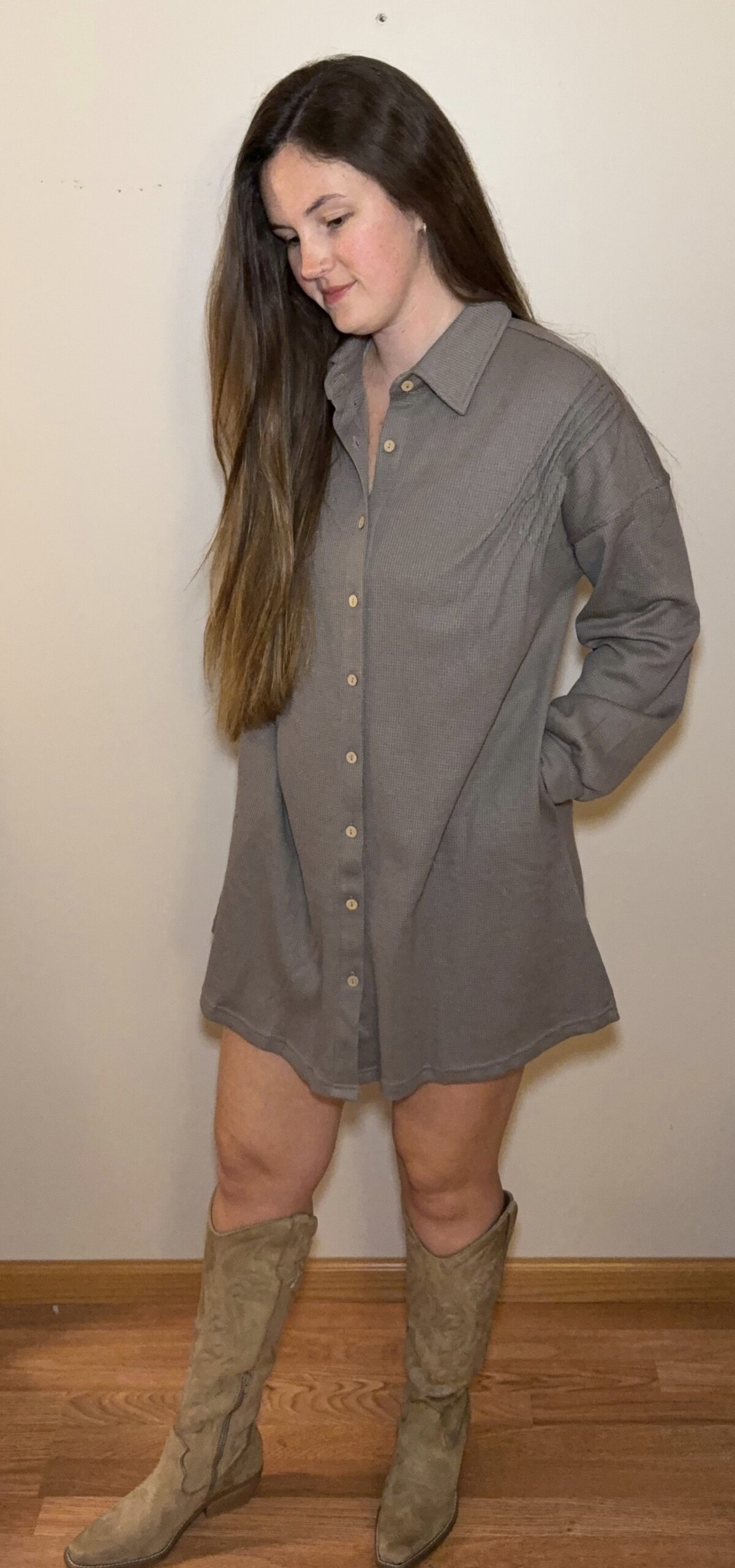 - Waffle knit texture adds visual interest to this versatile tunic dress.